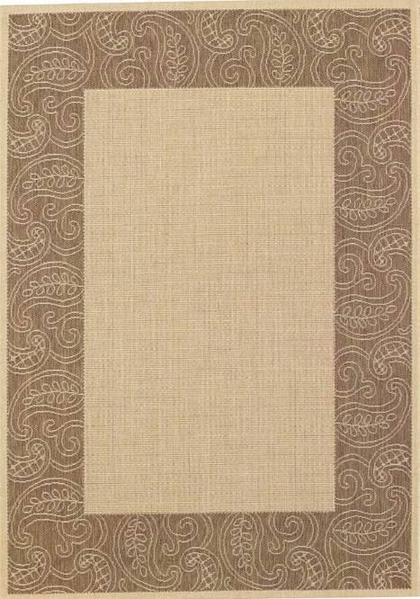 The Finesse Foulard Coffee Outdoor Rug is Machine Woven in 100% Olefin, and manufactured in France. Very versatile, this rug can be used indoors or outdoors on porches, verandas or you might want to use one in a busy area of the house. Spills wipe away with damp cloth and warm water. These all weather outdoor rugs are perfect for porch and patio thanks to a water, mold and mildew resistant construction. Each rug measures 7ft 10in by 11ft.