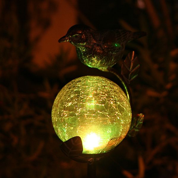 The Aquarius Birdbath Solar Stake Light is a two-in-one decorative birdbath and solar accent for the garden. The attractive crackled glass orb lights up with a color-changing LED. The birds and leaves design on the stake light adds an attractive and natural touch to your garden. The light features an integral solar panel and turns on at dusk and off at dawn. Using the power of the sun, the light shines for up to 8 hours. With no operating costs, this birdbath and light is an economical way to add beauty to your outdoor living space.